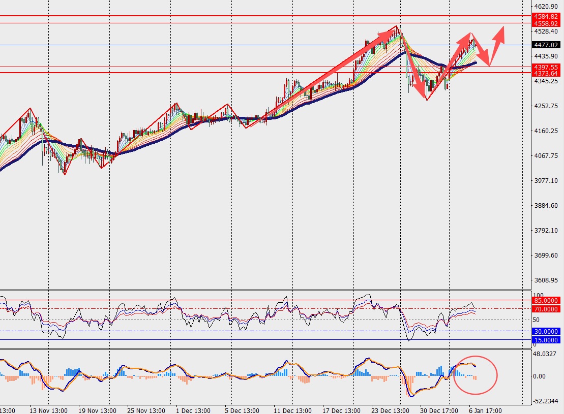 从技术结构来看,黄金在 H4 周期内高位震荡整理,并稳固运行于 48 日多空分界线上方。当前 MACD 双线趋于走平,量能有所收敛,显示市场短线动能减弱,正处于蓄势阶段。若价格成功站稳并有效突破 5000 美元关口,或将开启新一轮加速上行行情。