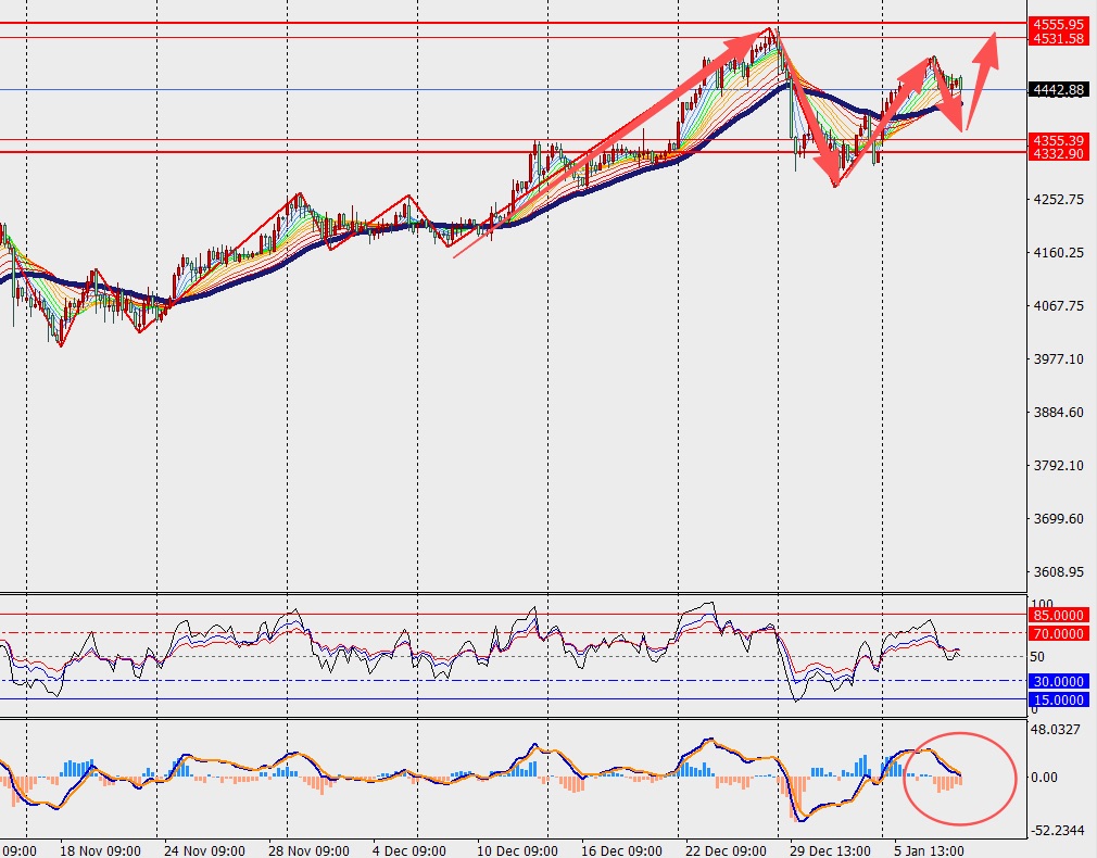 从技术走势来看,4 小时图显示金价仍运行于 48 日均线上方,整体趋势保持相对稳健。不过,MACD 动能指标在零轴上方逐步走平,多头动能有所放缓。金价目前在 4440 美元/盎司附近震荡,短线以区间整理为主,整体仍处于关键均线系统之上。关键价位: