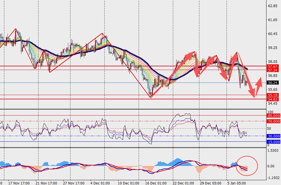 从技术结构来看,原油 4 小时级别走势仍偏弱,价格运行于 48 日多空分界线下方。MACD 双线位于零轴下方,动能指标维持弱势,显示空头力量尚未明显衰竭。短期走势仍以震荡偏弱为主,需关注关键支撑区域的有效性。关键价位: