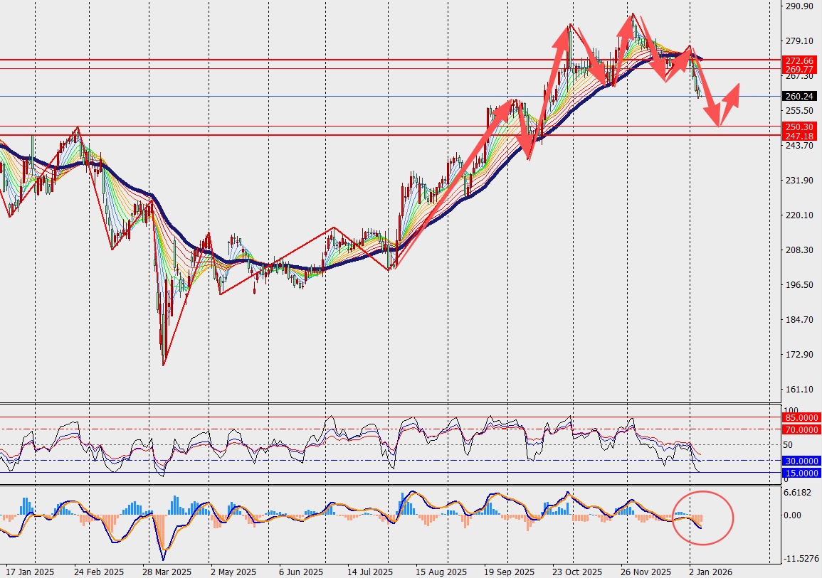 从技术走势来看,苹果股价在 4 小时级别仍运行于 48 日多空分界线下方,短期趋势偏弱。MACD 双线位于零轴下方,动能指标未出现明显反转信号,显示多头力量仍需进一步蓄势。短线需关注关键支撑区域的有效性。