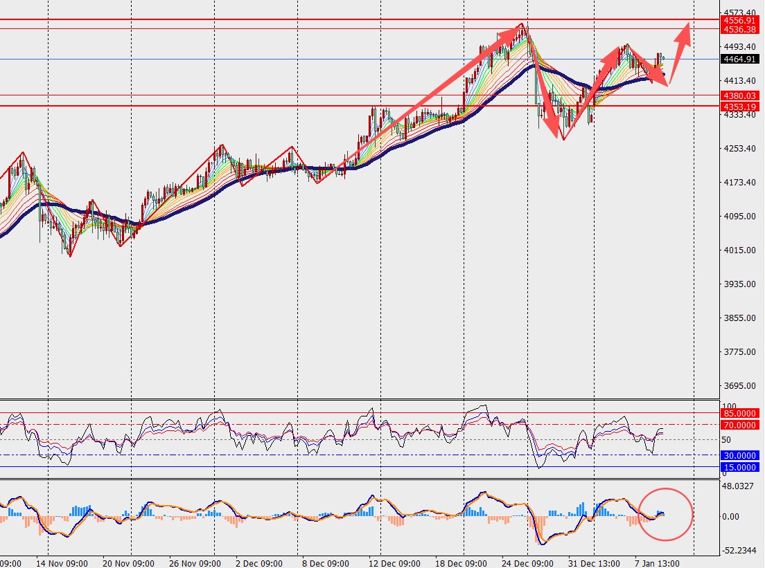 从技术走势来看,黄金在 4 小时级别延续震荡反弹格局,价格运行于 48 日多空分界线上方。MACD 双线位于零轴附近,动能指标未出现明显背离信号,短线趋势仍偏多。若地缘政治风险或财政政策不确定性升温,金价中长期仍具上行潜力,市场对 2026 年上半年金价上探 5000 美元/盎司的预期有所升温。