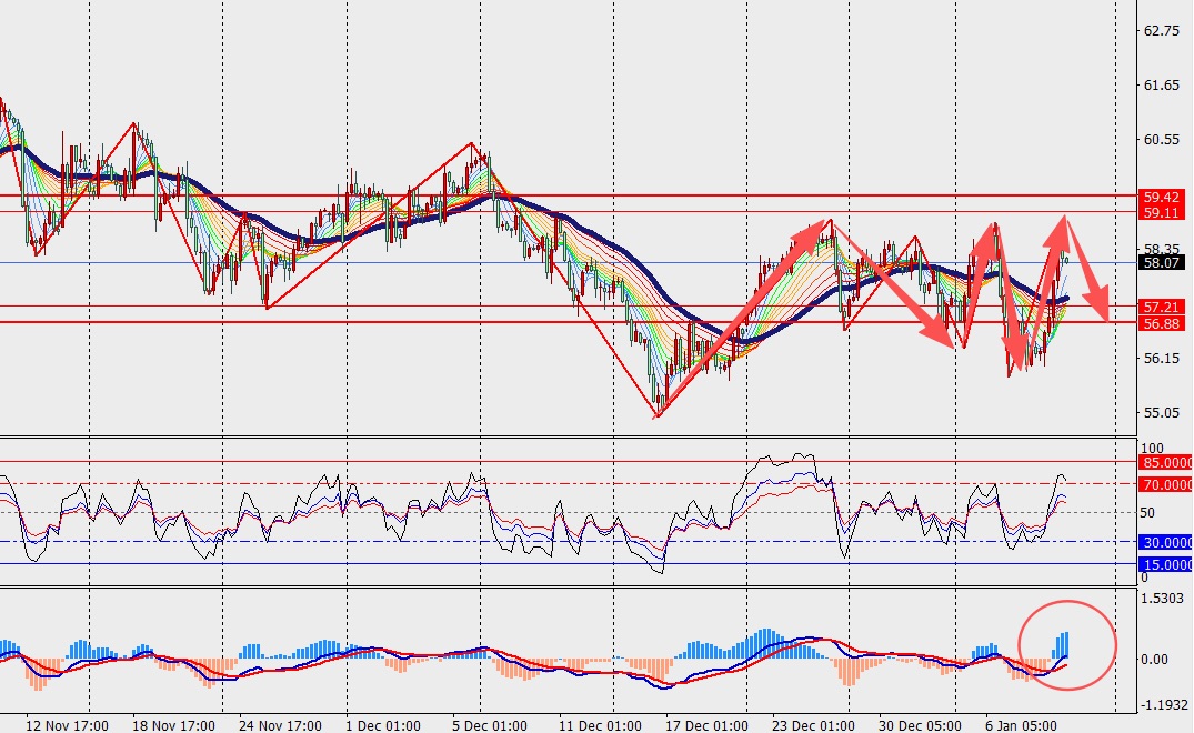 从技术走势来看,美原油在 4 小时级别呈现震荡偏强格局,价格运行于 48 日多空分界线上方。MACD 双线在零轴附近逐步走强,动能指标显示上行力量有所增强。同时,部分产油国因运输与制裁问题导致供应受限,叠加伊拉克方面计划限制原油出口,市场对供应端的担忧进一步升温。